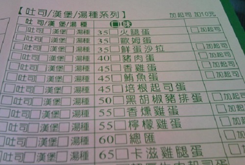 以下は、私が利用している早餐店での実際に購入した値段になります。