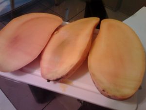 マンゴーの食べ方は下の画像のように、魚を三枚におろす要領で、中心にある平たい種を取り除きます。