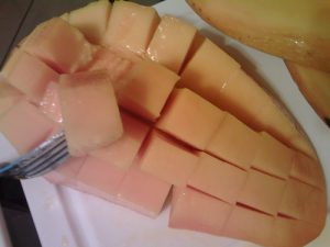 果肉にナイフを格子状に入れていき、反り返すようにすると、画像のように食べやすくなります。