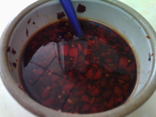 下の画像のような唐辛子油醤油ダレの調味料(めちゃくちゃ辛い!)を掛けて食べることもあります。