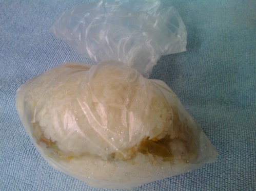 また、日本のお握りやコンビニで販売されているお握りのように海苔はなく、ビニール袋で丸めて提供されるのも特徴的ですね。
